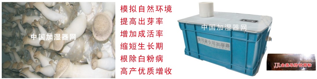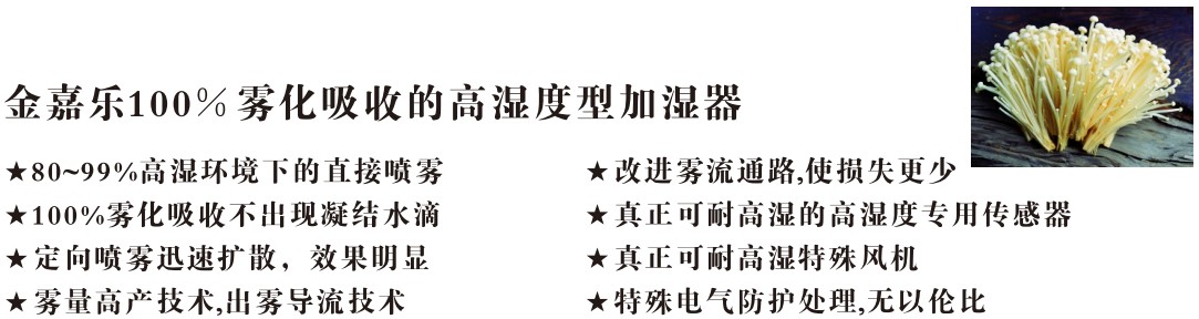 影响食用菌优质高产的一个重要因素-----湿度,多指空气相对湿度,这不仅与食用菌生长发育有直接关系,而且还影响料内水分的散发,特别是在子实体发育期间,若湿度不足定会减产,若低于60%子实体不生长,低于45%原基停止分化,已分化的幼菇也会枯萎死亡。适宜的空气湿度为85%-93%(子实体生长期)。栽培过程中以喷雾方式给空气加湿,提高空气相对湿度是必需的措施。金嘉乐公司经过几年的市场实践,根据食用菌行业的特点,专门生产出了"雾一腿"系列食用菌加湿器。自然环境下的工业化养殖——金嘉乐"雾一腿"系列加湿器为您提供原生态的生产环境。