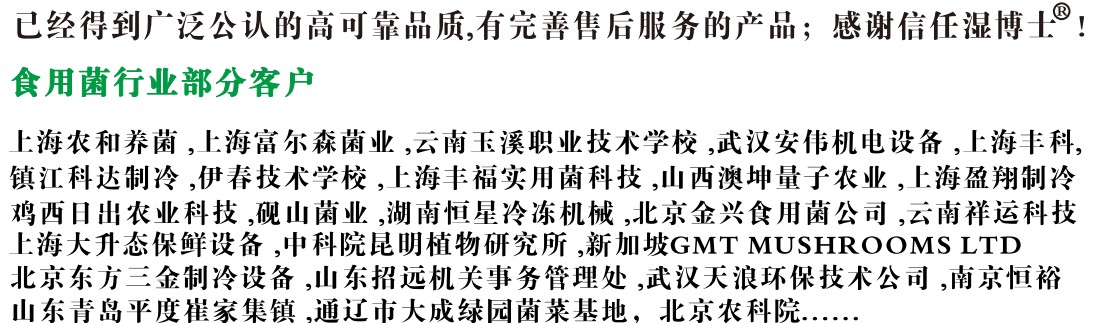 例如:栽培腿蘑的湿度,发菌期间空气相对湿度80%-95%,低于60%菌盖表面鳞片反卷,湿度在95%以上时,菌盖易得斑点病。"雾一腿"系列加湿器特效(以白灵菇为例):1、出芽率:从60%增加到80%2、成活率:高达90%3、菌芽培养和出库天数比以前缩短7天;移至大棚,生长期比以前缩短5天,整体周期缩短12天4、根除白粉病