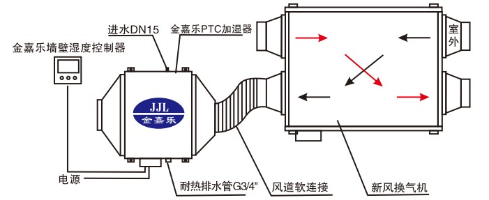 金嘉乐新风加湿一体机系列加湿器的工作原理是用PTC电陶瓷加热而产生的热蒸汽与室外新风充分混合,对干燥新风空气的加湿过程。由内置送风机送到每个房间,当室内湿度达到用户要求时,